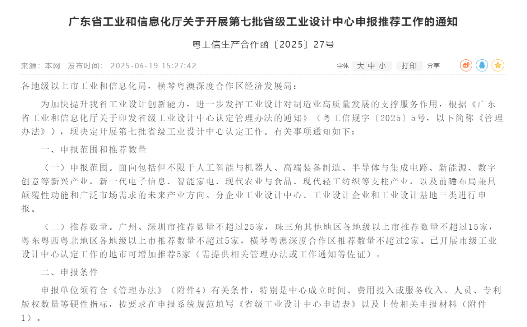 申报范围+推荐名额 1.企业工业设计中心:人工智能、高端装备、新能源等新兴产业,及电子信息、智能家电等支柱产业均可申报; 2.工业设计企业:专注设计服务的企业,无论规模大小,只要实力过硬就有机会; 3.工业设计基地:产业集群园区、设计孵化基地等,助力区域设计生态建设。 • 广州、深圳:不超过25家(市级已认定可加5家) • 珠三角其他地区:不超过15家(市级已认定可加5家) • 粤东粤西粤北:不超过5家(市级已认定可加5家) • 横琴粤澳深度合作区:不超过2家 申报条件 ✅ 资金投入:珠三角企业年设计经费≥500万,粤东粤西粤北≥300万; ✅ 人才配置:珠三角设计人员≥25人,粤东粤西粤北≥15人,50% 以上需本科/中级职称/技师以上; ✅ 成果要求:近两年设计相关专利/版权/奖项,珠三角≥15项,粤东粤西粤北≥10项; ✅ 其他:独立设计中心成立≥2年,无重大违法记录(完整条件见附件)。 ✅ 经营规模:珠三角年设计收入≥500万,粤东粤西粤北≥300万,占总营收≥30%; ✅ 人员要求:珠三角设计人员≥30人,粤东粤西粤北≥18人,高学历/高技能人才占比≥50%; ✅ 知识产权:近两年设计成果,珠三角≥10项,粤东粤西粤北≥5项。 ✅ 规模要求:运营≥1年,面积≥5000㎡,珠三角入驻企业≥20 家、人员≥100人; ✅ 经济指标:珠三角年设计服务收入≥2000万,粤东粤西粤北≥1000万; ✅ 成果要求:近两年设计相关成果,珠三角≥50项,粤东粤西粤北≥25项。 申报小贴士 1.准备《省级工业设计中心申请表》及佐证材料(专利证书、财务报表、人员名单等); 2.关注当地工信局通知,及时提交申报系统; 3.市级已认定的企业,记得附上市级认定文件,可多拿5个推荐名额! 最后提醒 成为省级工业设计中心,还能享受: 1、优先纳入省级产业集群服务体系; 2、获得政府设计创新项目优先推荐; 3、对接高校、科研机构等设计资源; 4、提升品牌影响力,吸引投资与合作!(一)申报范围:三大类型,覆盖全产业