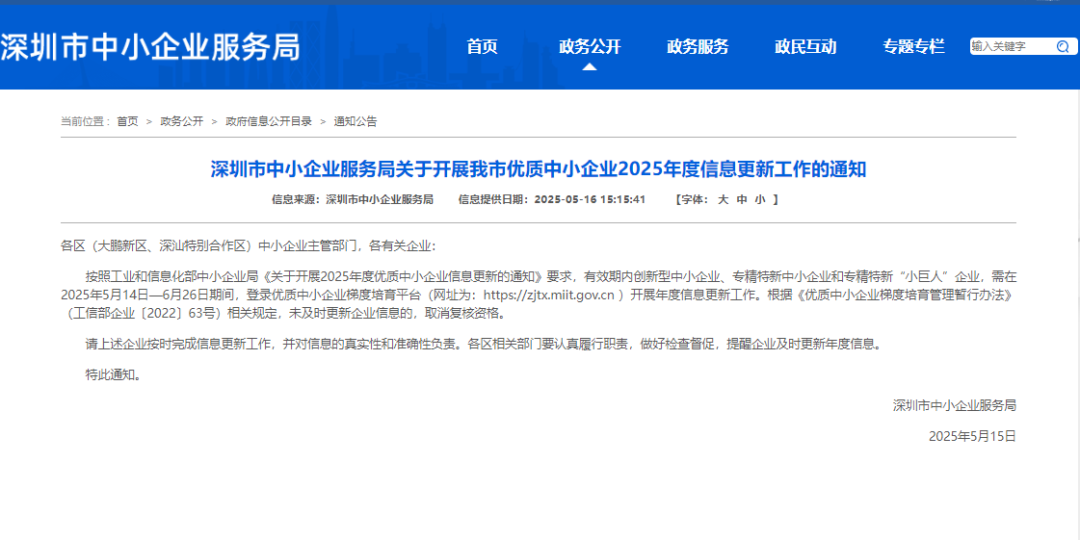 信息更新要求 根据工业和信息化部中小企业局《关于开展2025年度优质中小企业信息更新的通知》,有效期内的创新型中小企业、专精特新中小企业和专精特新“小巨人”企业,需要在2025年5月14日—6月26日期间,登录 优质中小企业梯度培育平台(网址:https://zjtx.miit.gov.cn ) ,完成年度信息更新工作。 未及时更新的后果 《优质中小企业梯度培育管理暂行办法》(工信部企业〔2022〕63号)白纸黑字规定:未及时更新企业信息,直接取消复核资格!这意味着什么?企业将不得不重新从最基础的流程开始,耗费大量人力、物力、财力,还可能错失发展良机,让之前的努力付诸东流! 企业与部门职责 企业自身要高度重视,按时完成信息更新,并确保内容真实、准确。各区(大鹏新区、深汕特别合作区)中小企业主管部门也别闲着,要切实履行职责,做好检查督促,及时提醒辖区企业,避免出现“漏网之鱼”。 时间不等人,信息更新已进入倒计时!别因一时疏忽,给企业发展埋下隐患。赶紧行动起来,完成信息更新,为企业的顺利复审保驾护航!